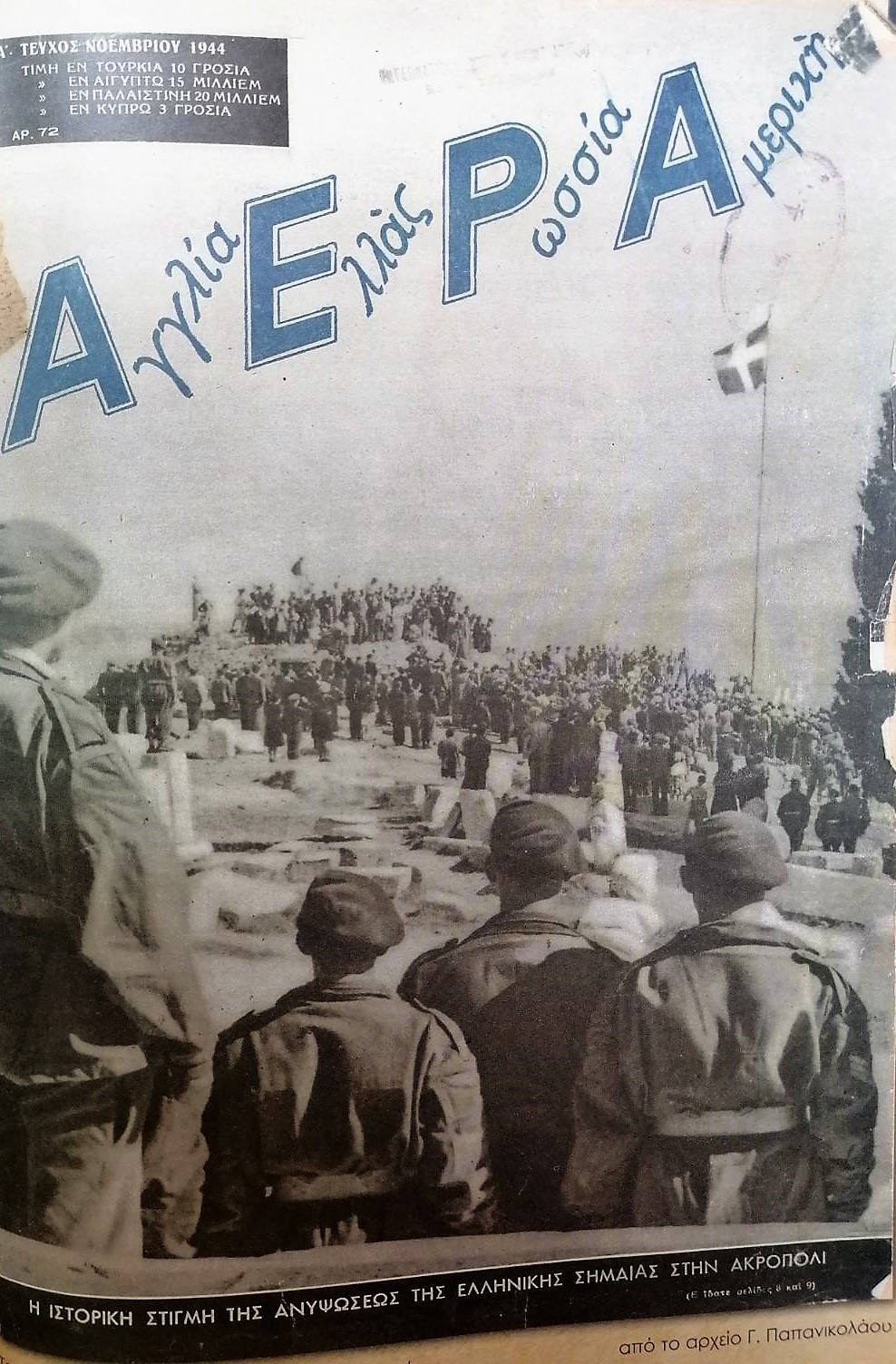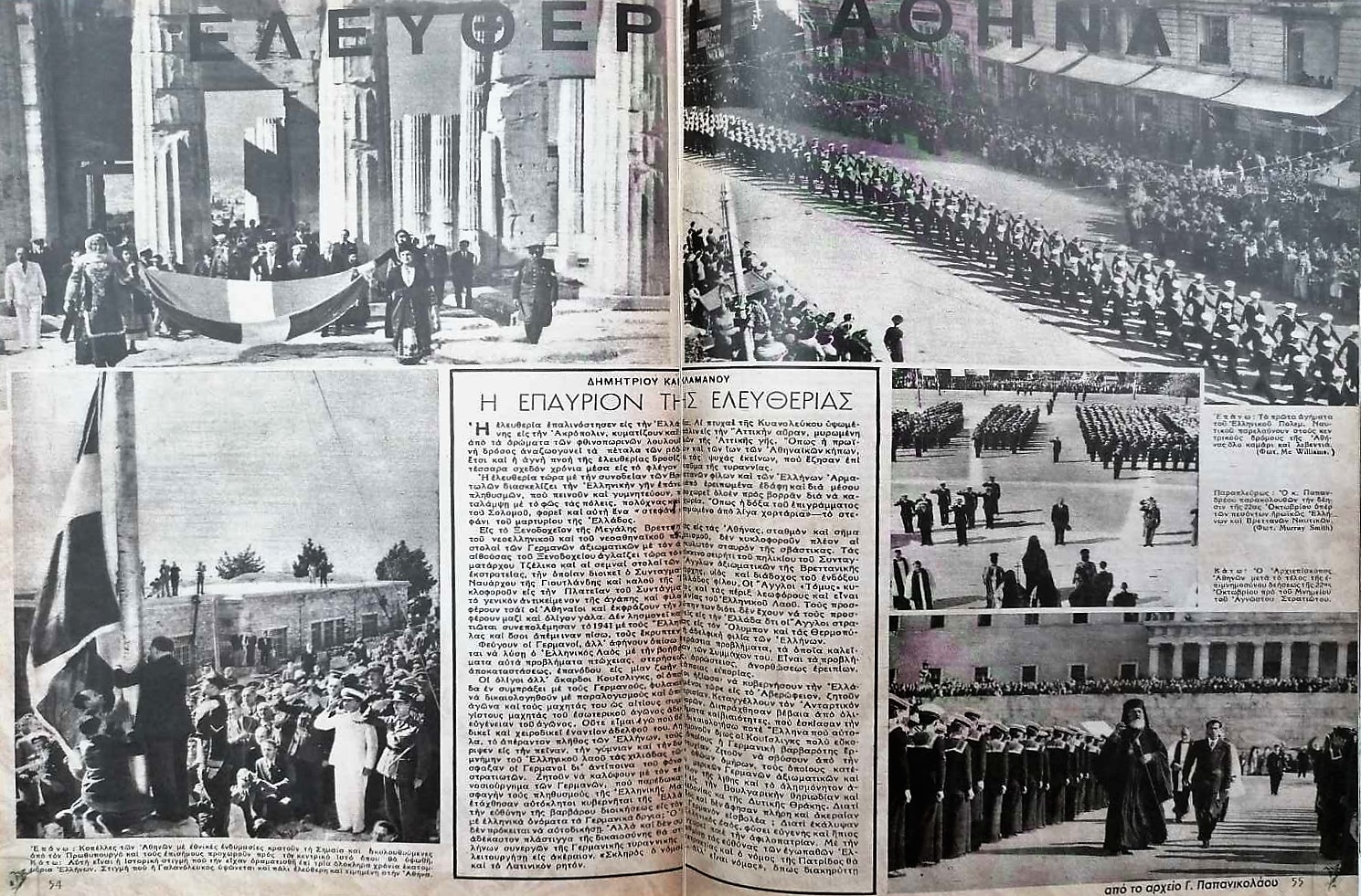 Ξεδιπλώθηκαν οι σημαίες, τα λάβαρα, τα αυτοσχέδια πανό με τα συνθήματα του αγώνα, της νίκης και της λευτεριάς. Ο μισητός αγκυλωτός σταυρός κατέβηκε από τον ιερό βράχο, διπλώθηκε με βία για να καταχωνιαστεί στις μαύρες σελίδες της ιστορίας, στο σκοτεινό χρονοντούλαπο της βίας, του μίσους και του αίματος και στη θέση της μπήκε ξανά η γαλανόλευκη, το ιερό σύμβολο του έθνους και της πατρίδας.