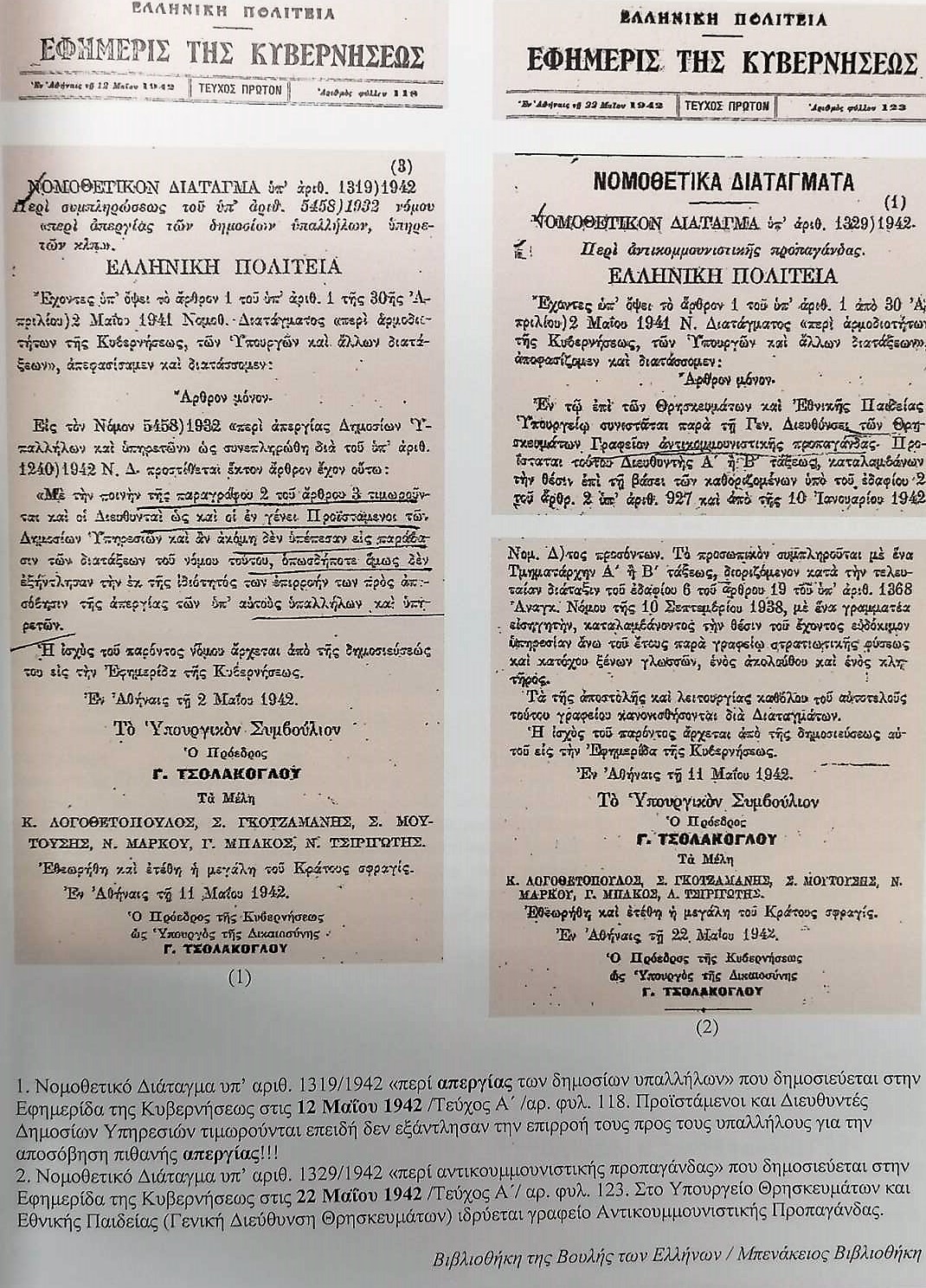«Όταν η απεργία δημοσίων λειτουργών διενεργείται του κράτους διατελούντος υπό εξαιρετικάς συνθήκας και περιστάσεις αποτελεί ιδιώνυμον έγκλημα τιμωρούμενον και δια της ποινής του θανάτου. Οι απεργούντες εισάγονται δι απ ευθείας κλήσεως εντός 24 ωρών ενώπιον εκτάκτου πενταμελούς Στρατοδικείου καταρτιζομένου δι αποφάσεως του Υπουργού της Εθνικής Αμύνης. Κατά της εκδιδομένης αποφάσεως ουδέν ένδικον μέσον επιτρέπεται, εκτελείται δ αυτής εντός 24 ωρών από της εκδόσεώς της.» «Ελεύθερον Βήμα», 18 Απριλίου 1942.