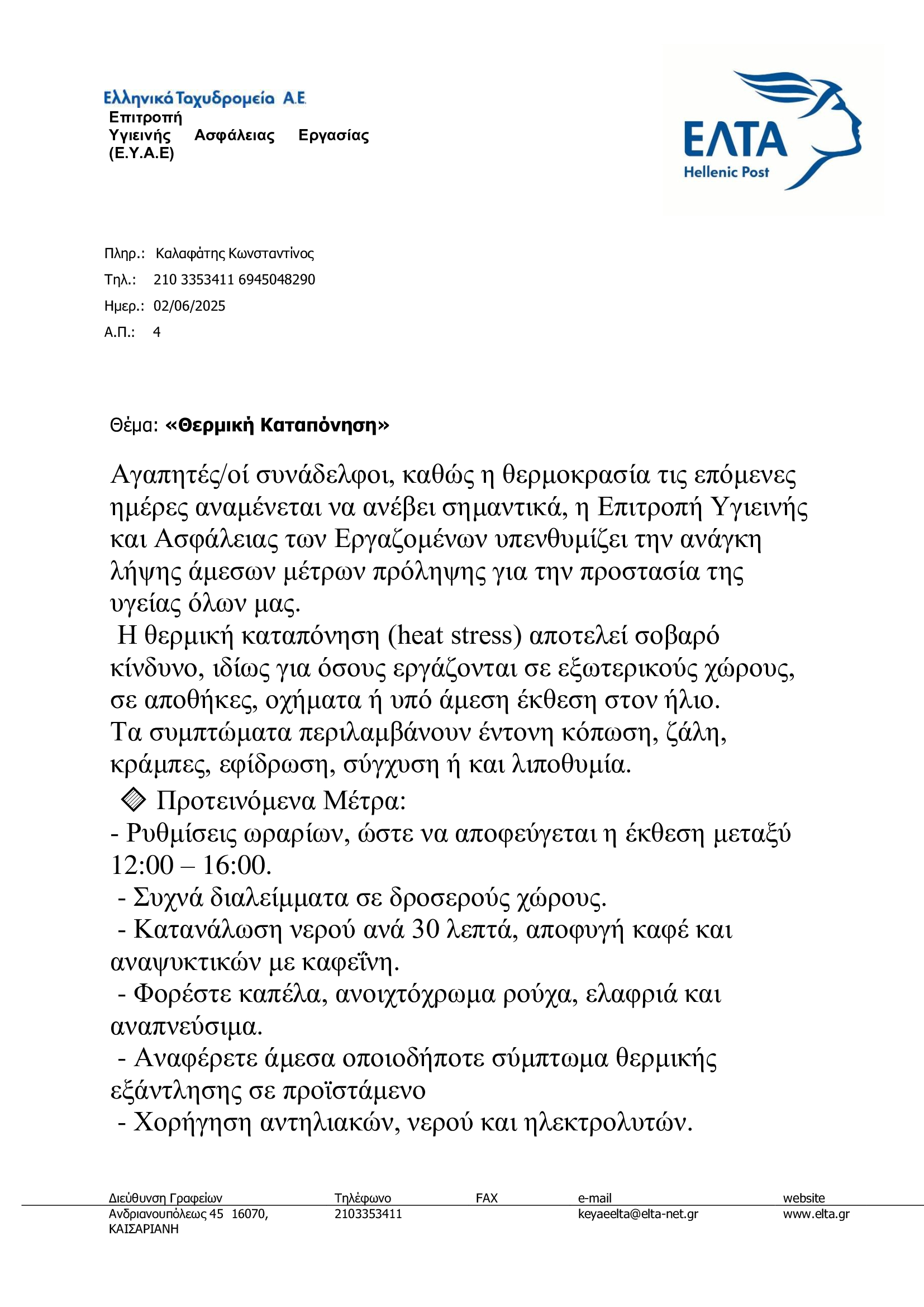 ΚΕΥΑΕ ΕΛΤΑ • 2 ΙΟΥΝΙΟΥ 2025Ανακοίνωση Επιτροπής Υγείας και Ασφάλειας Εργαζομένων ΕΛΤΑ για τη θερμική καταπόνηση