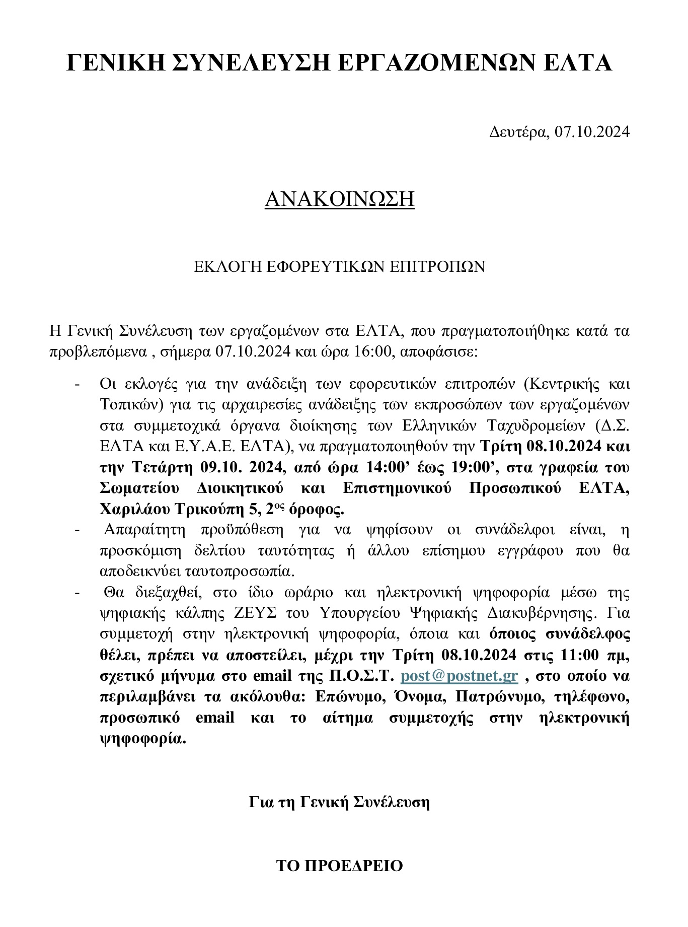 Ανακοίνωση Γενικής Συνέλευσης Εργαζομένων ΕΛΤΑ για την εκλογή Εφορευτικών Επιτροπών