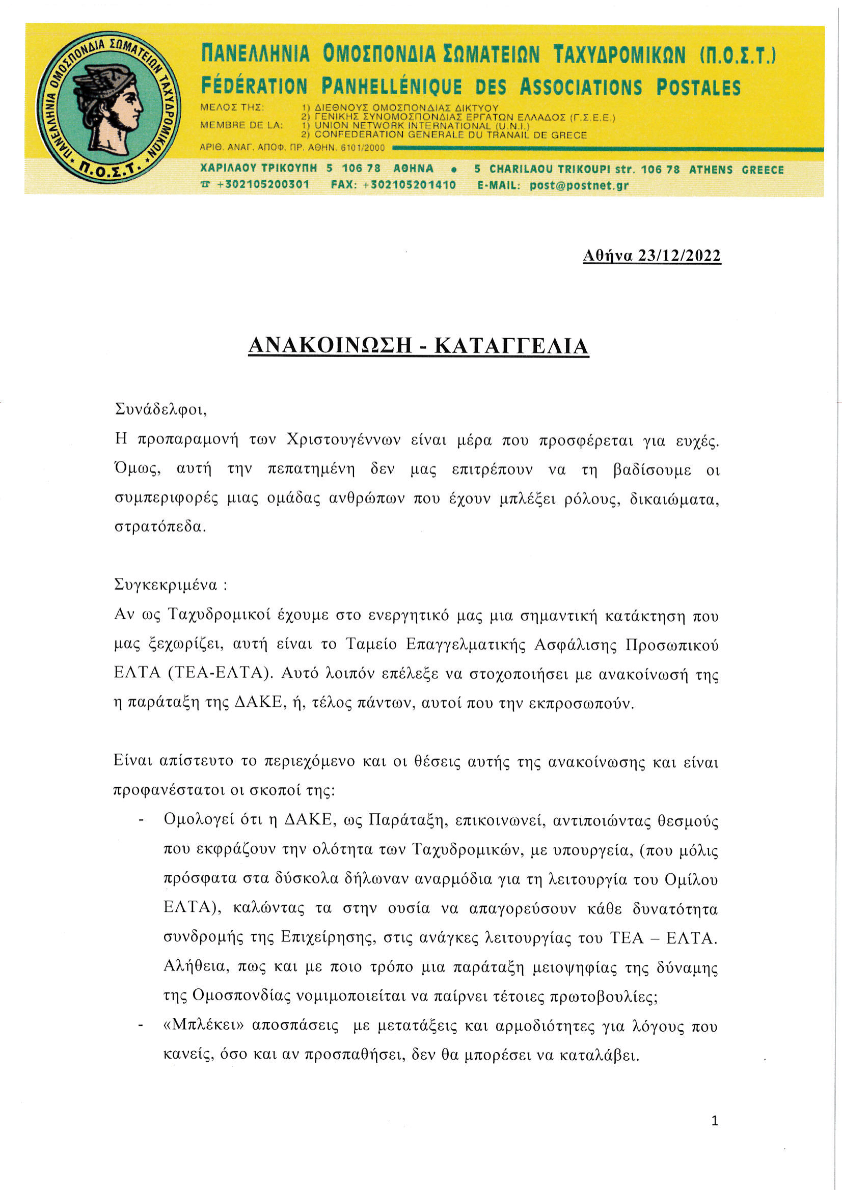 ΚΑΤΑΓΓΕΛΙΕΣ • 23 ΔΕΚΕΜΒΡΙΟΥ 2022Ανακοίνωση καταγγελία της Π.Ο.Σ.Τ. κατά ανακοίνωσης της ΔΑΚΕ για το ΤΕΑ ΕΛΤΑ