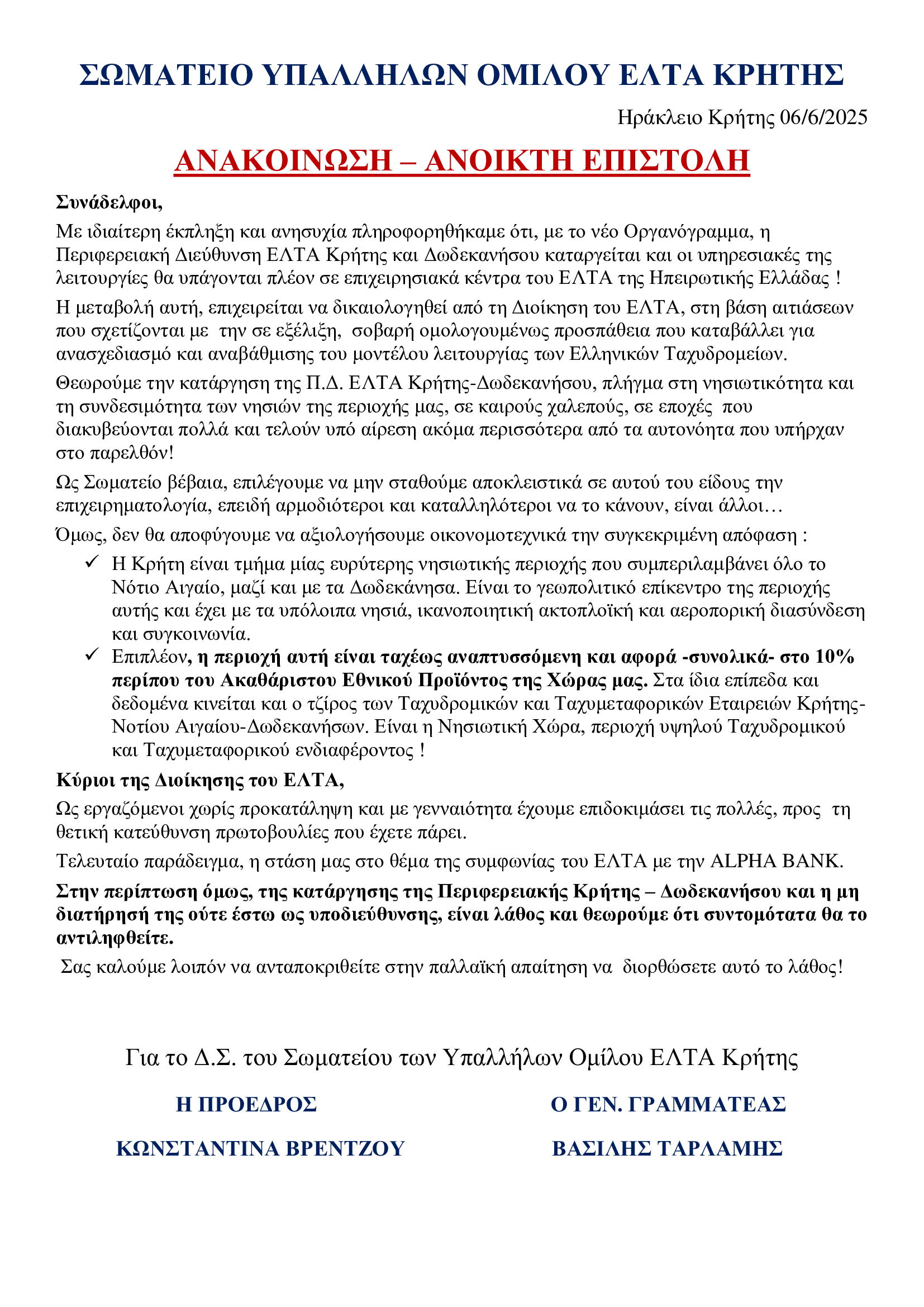 Ανακοίνωση Σωματείου Υπαλλήλων Ομίλου ΕΛΤΑ Κρήτης για την κατάργηση της Περ/κής Δ/νσης Κρήτης – Δωδεκανήσου