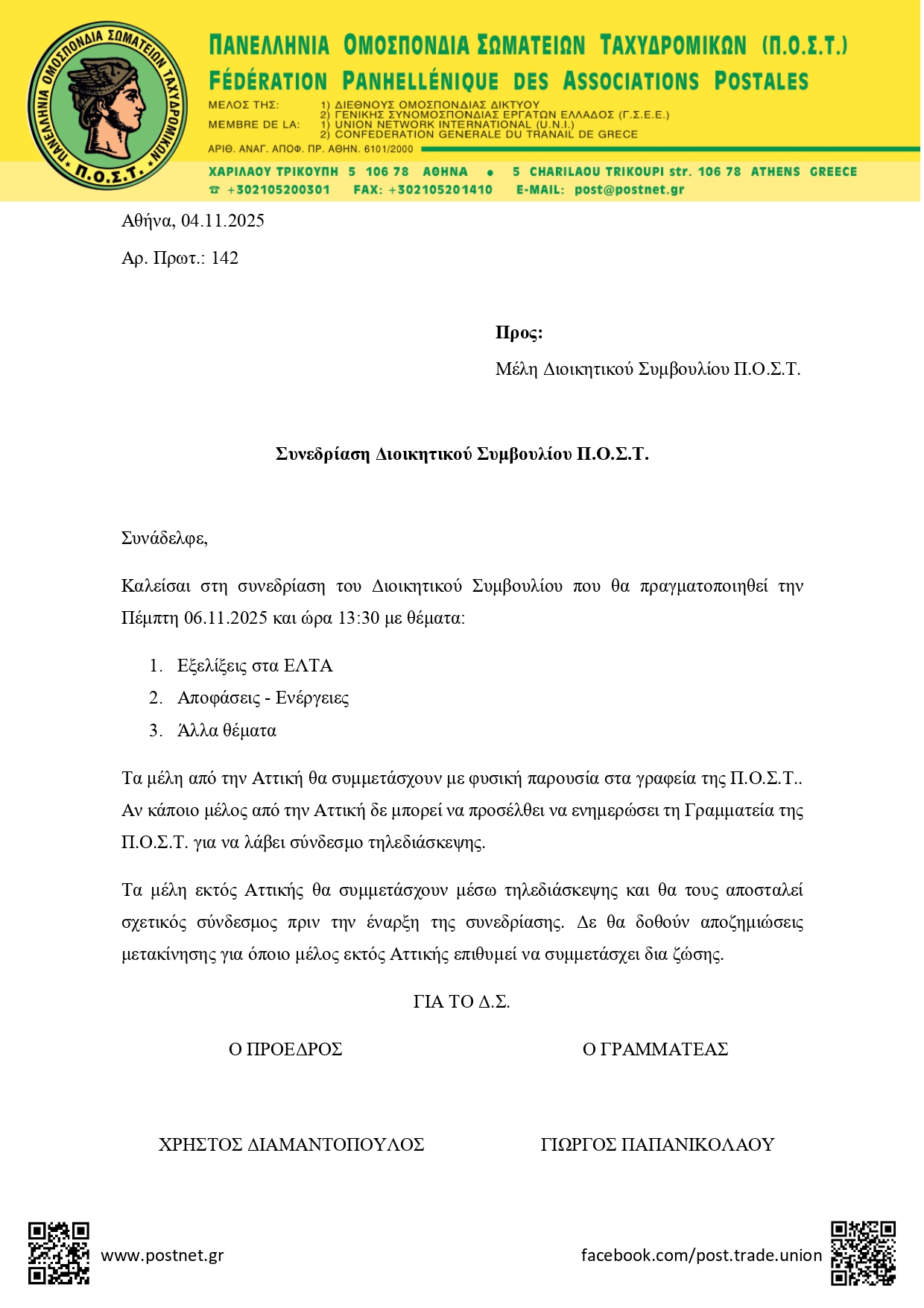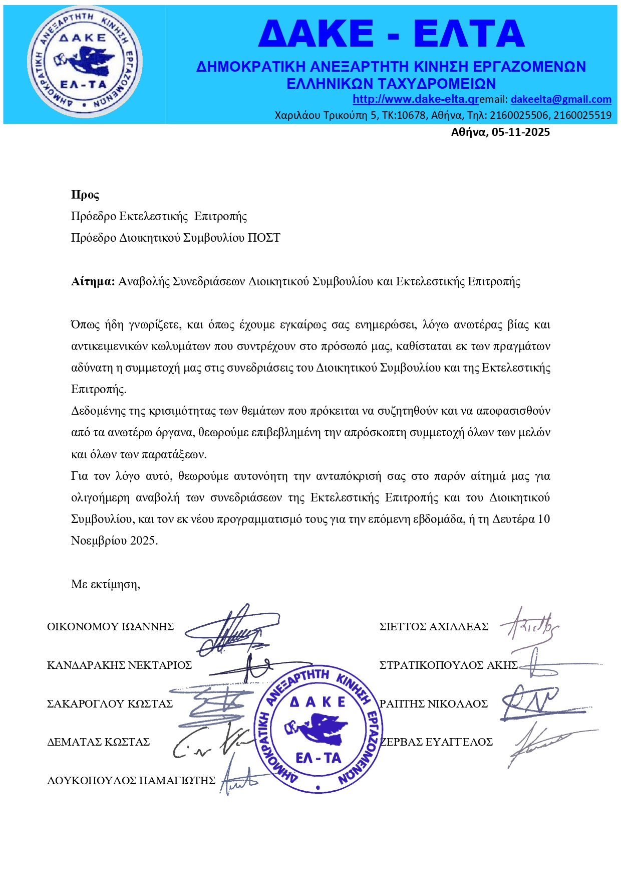 Σας ενημερώνουμε ότι οι συνεδριάσεις της Εκτελεστικής Επιτροπής και του Διοικητικού Συμβουλίου της Π.Ο.Σ.Τ., που ήταν προγραμματισμένες για την Τρίτη 4 Νοεμβρίου, αναβλήθηκαν μετά από αίτημα της ΔΑΚΕ ΕΛΤΑ. Ορίστηκε ως νέα ημερομηνία πραγματοποίησής τους η Πέμπτη 6 Νοεμβρίου με την ίδια θεματολογία, όμως, μετά από νέο αίτημα της ΔΑΚΕ ΕΛΤΑ, αναβάλλονται ξανά για την ερχόμενη εβδομάδα.