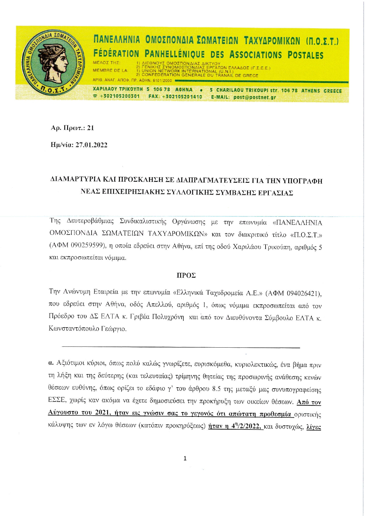 ΔΙΑΜΑΡΤΥΡΙΑ ΚΑΙ ΠΡΟΣΚΛΗΣΗ ΣΕ ΔΙΑΠΡΑΓΜΑΤΕΥΣΕΙΣ ΓΙΑ ΤΗΝ ΥΠΟΓΡΑΦΗ ΝΕΑΣ ΕΠΙΧΕΙΡΗΣΙΑΚΗΣ ΣΥΛΛΟΓΙΚΗΣ ΣΥΜΒΑΣΗΣ ΕΡΓΑΣΙΑΣ