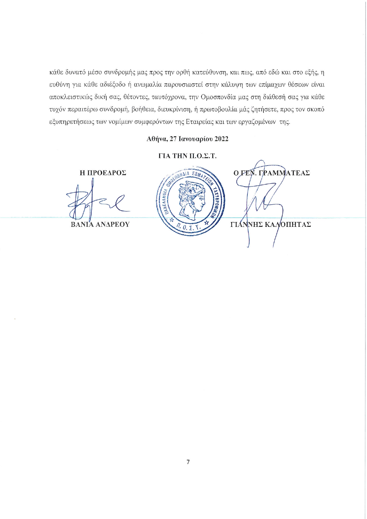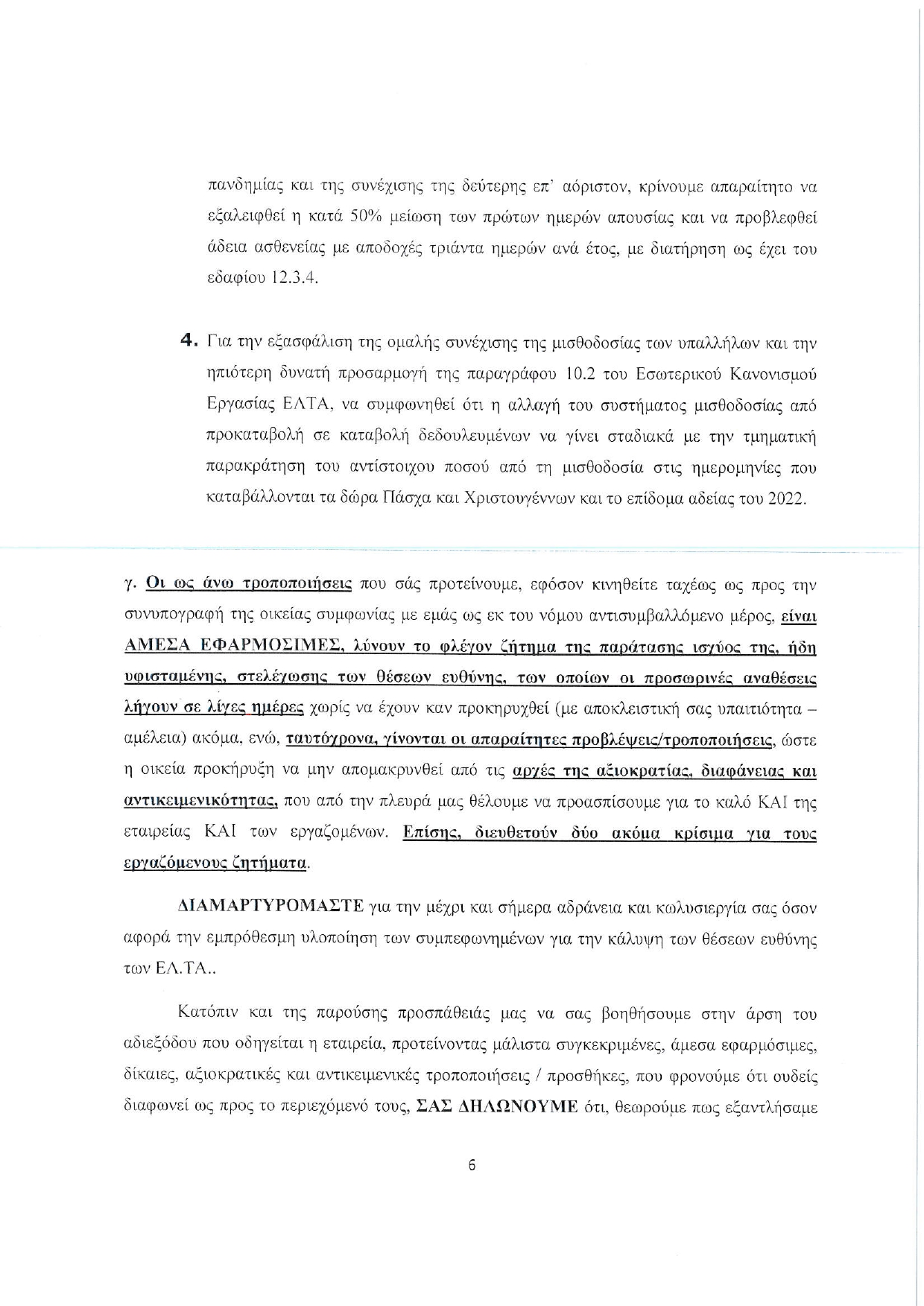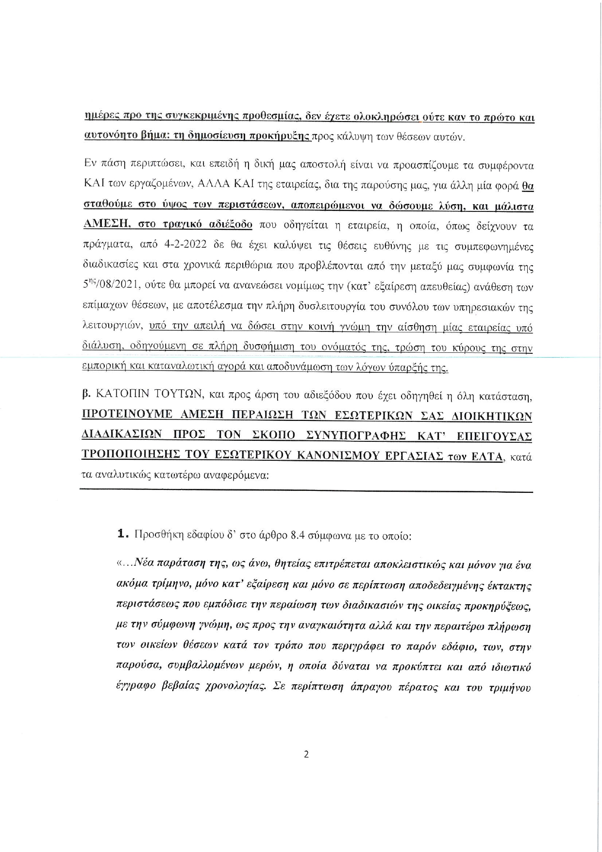 Εν πάση περιπτώσει, και επειδή η δική μας αποστολή είναι να προασπίζουμε τα συμφέροντα ΚΑΙ των εργαζομένων, ΑΛΛΑ ΚΑΙ της εταιρείας, δια της παρούσης μας, για άλλη μία φορά θα σταθούμε στο ύψος των περιστάσεων, αποπειρώμενοι να δώσουμε λύση, και μάλιστα ΑΜΕΣΗ, στο τραγικό αδιέξοδο που οδηγείται η εταιρεία, η οποία, όπως δείχνουν τα πράγματα, από 4-2-2022 δε θα έχει καλύψει τις θέσεις ευθύνης με τις συμπεφωνημένες διαδικασίες και στα χρονικά περιθώρια που προβλέπονται από την μεταξύ μας συμφωνία της 5ης/08/2021, ούτε θα μπορεί να ανανεώσει νομίμως την (κατ’ εξαίρεση απευθείας) ανάθεση των επίμαχων θέσεων, με αποτέλεσμα την πλήρη δυσλειτουργία του συνόλου των υπηρεσιακών της λειτουργιών, υπό την απειλή να δώσει στην κοινή γνώμη την αίσθηση μίας εταιρείας υπό διάλυση, οδηγούμενη σε πλήρη δυσφήμιση του ονόματός της, τρώση του κύρους της στην εμπορική και καταναλωτική αγορά και αποδυνάμωση των λόγων ύπαρξής της.