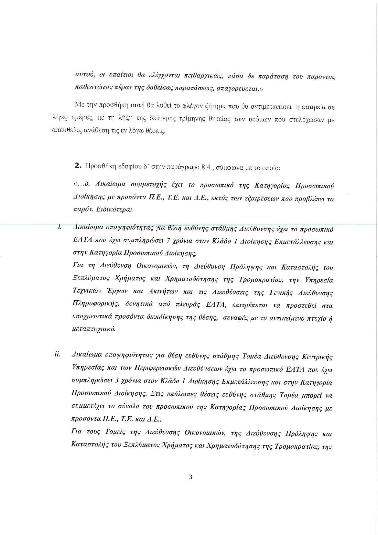 Με την προσθήκη αυτή θα αντιμετωπιστεί η αναγκαιότητα προσδιορισμού συγκεκριμένων, πιο εξειδικευμένων, προσόντων των υποψηφίων ως προς ορισμένες θέσεις ευθύνης, χωρίς όμως να θίγεται το αίσθημα αξιοκρατίας, αντικειμενικότητας και σεβασμού της ratio του υπάρχοντος Εσωτερικού Κανονισμού Εργασίας ΕΛΤΑ.