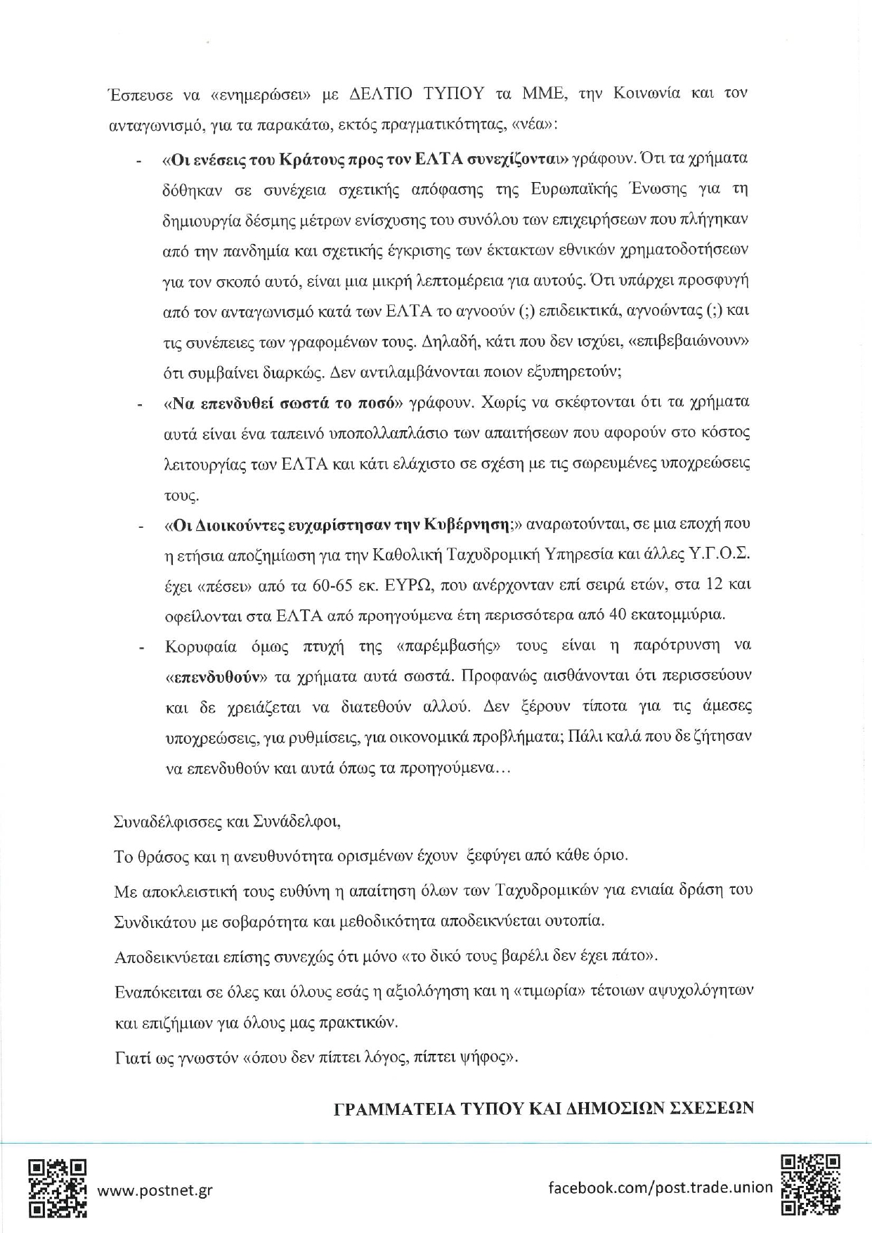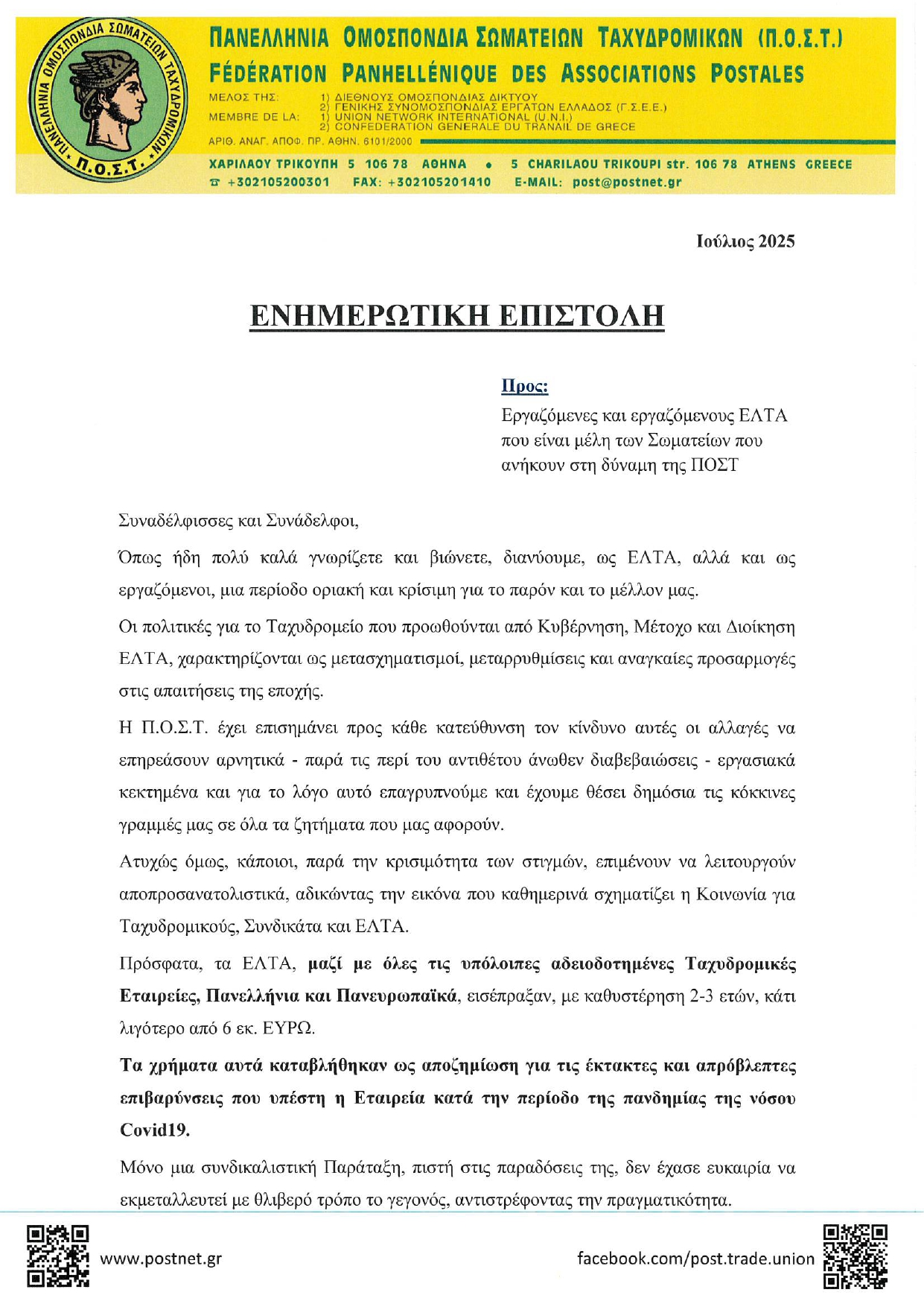 ΕΠΙΣΤΟΛΕΣ • 26 ΙΟΥΛΙΟΥ 2025Ενημερωτική επιστολή Π.Ο.Σ.Τ. προς τα μέλη των Σωματείων που ανήκουν στη δύναμή της