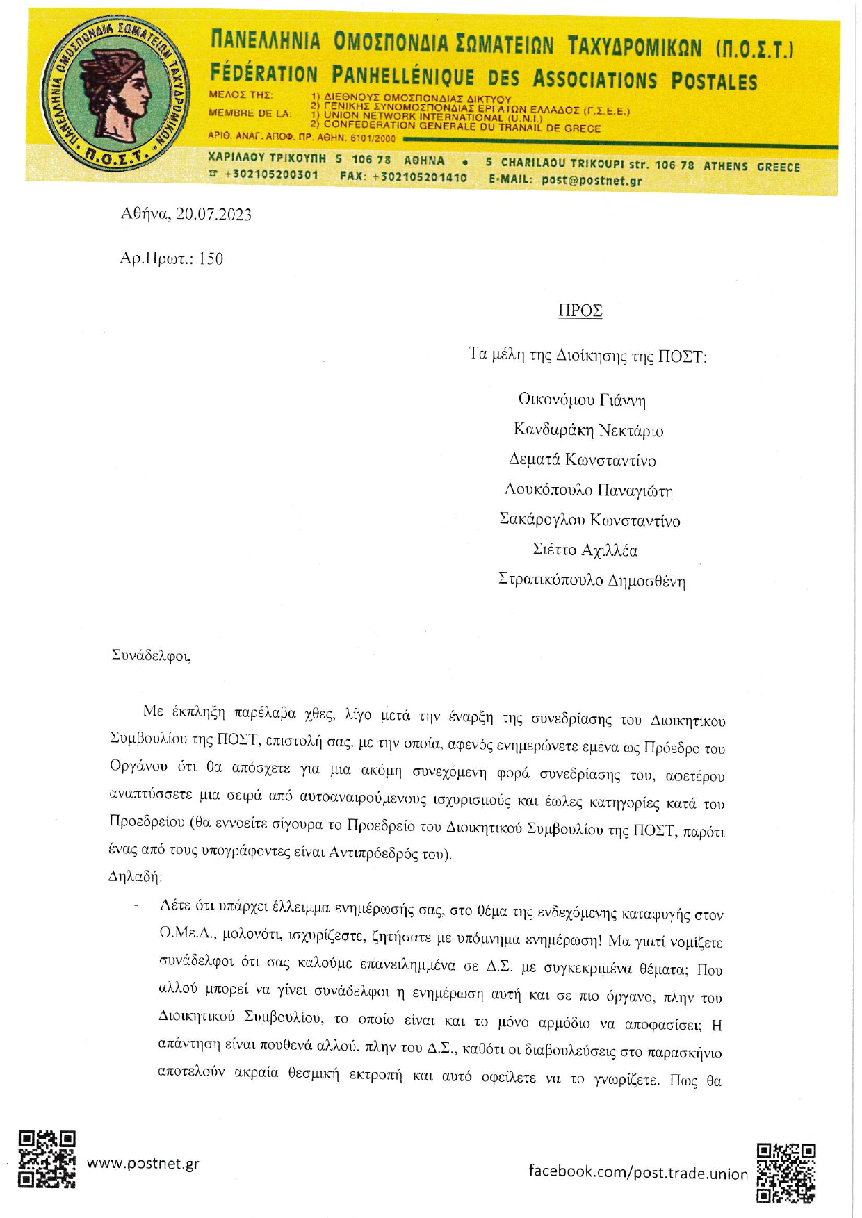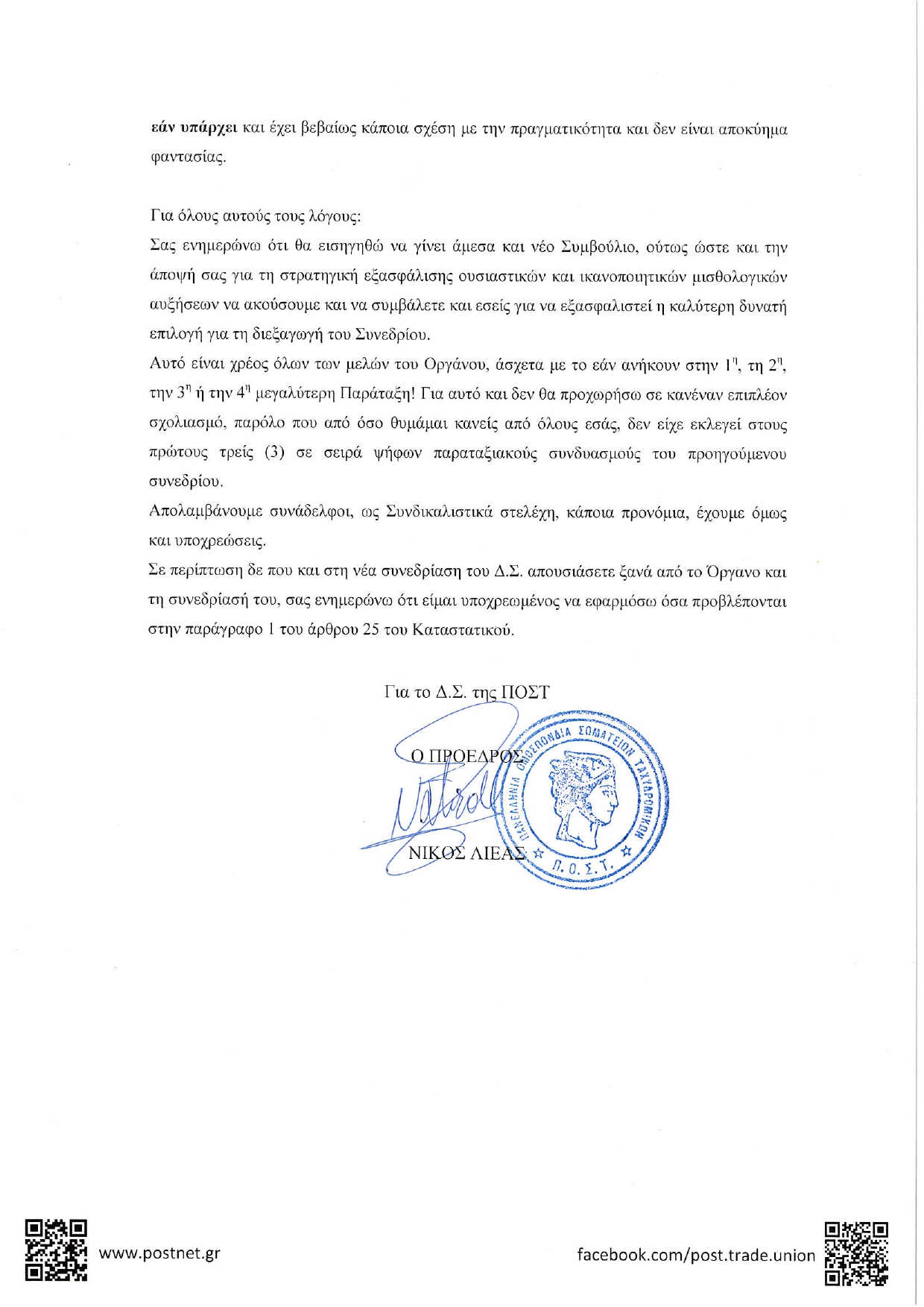 Επιστολή – απάντηση του Προέδρου του Δ.Σ. της Π.Ο.Σ.Τ. στη ΔΑΚΕ ΕΛΤΑ