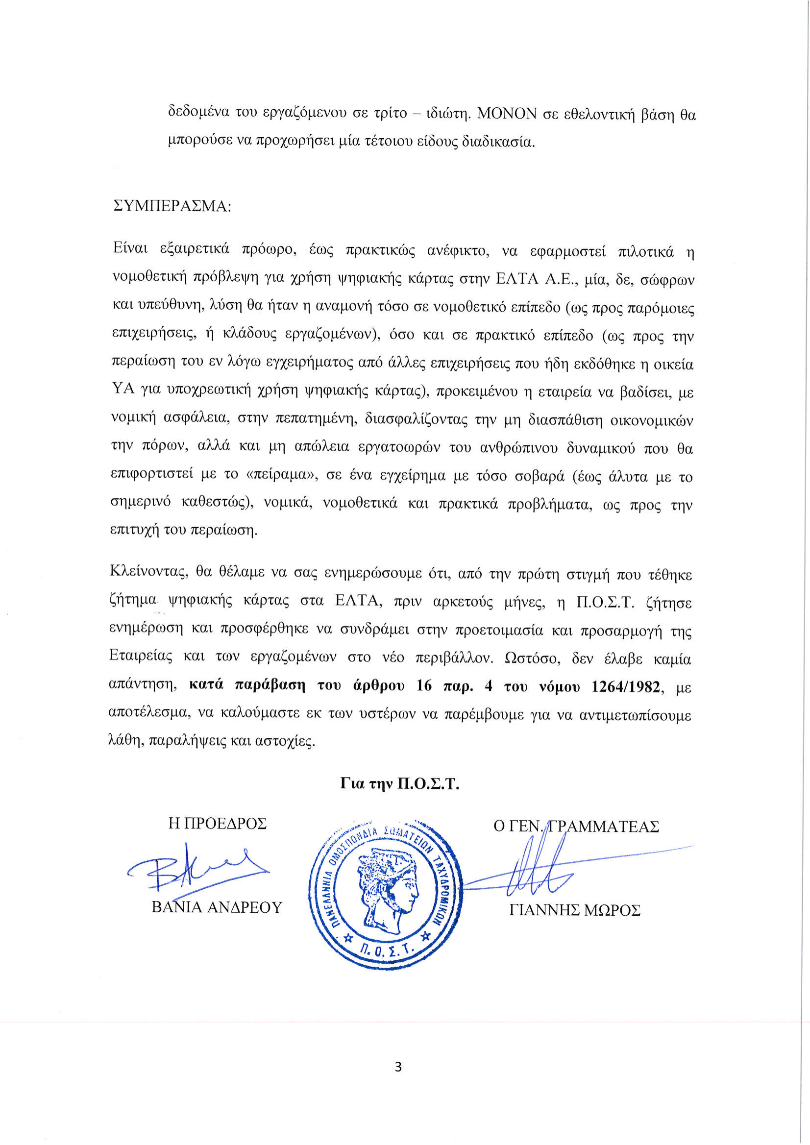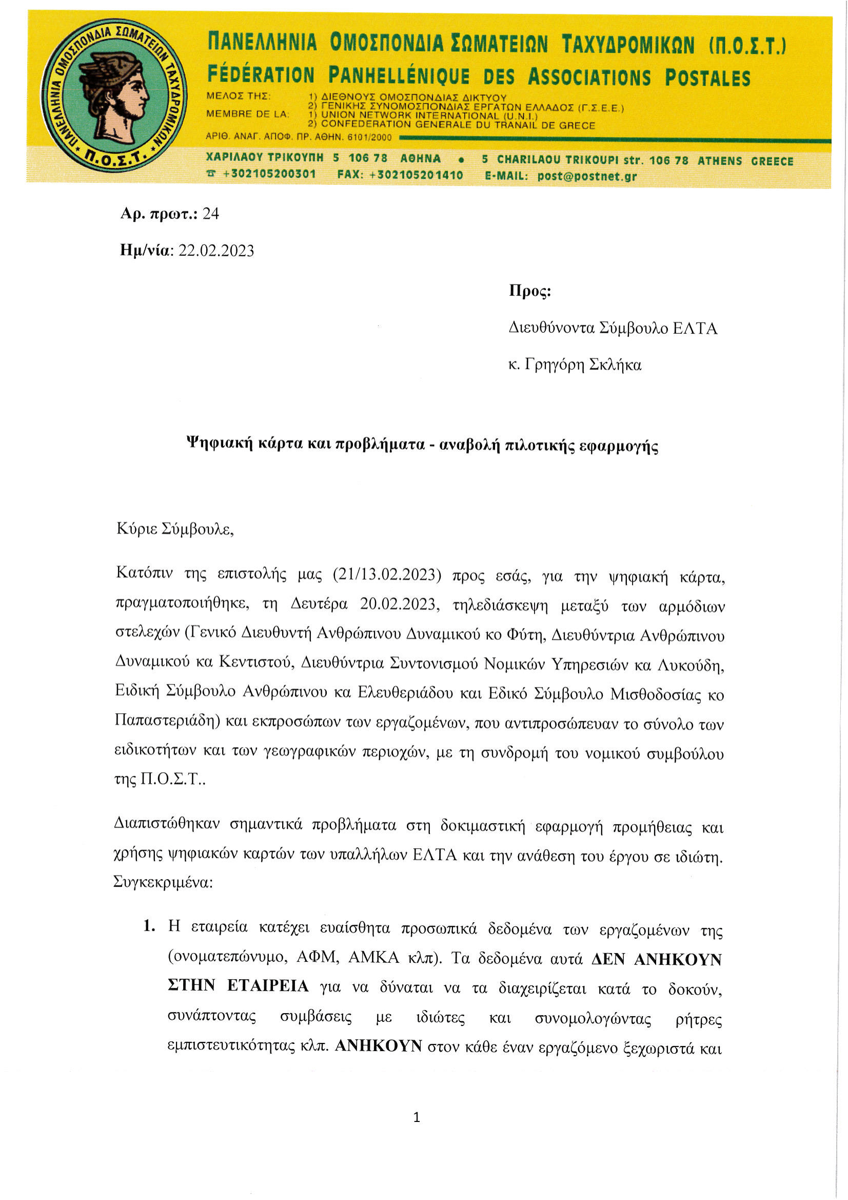 ΕΠΙΣΤΟΛΕΣ • 22 ΦΕΒΡΟΥΑΡΙΟΥ 2023Επιστολή της Π.Ο.Σ.Τ. στον Διευθύνοντα Σύμβουλο για τα προβλήματα πιλοτικής εφαρμογής της ψηφιακής κάρτας και την αναγκαστική αναβολή της