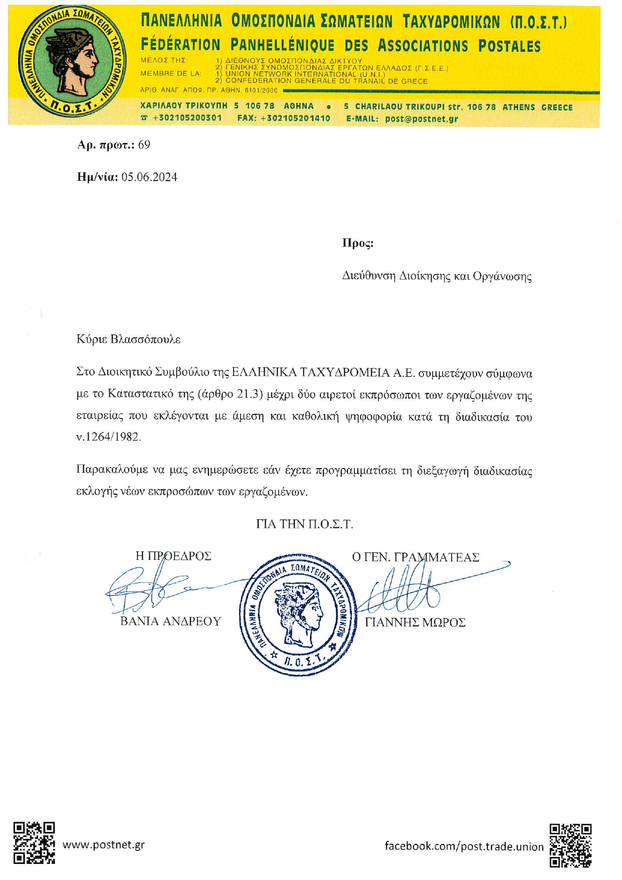 Επιστολή της Π.Ο.Σ.Τ. στη Διοίκηση των ΕΛΤΑ για την εκλογή εκπροσώπων εργαζομένων στο ΔΣ της Εταιρείας