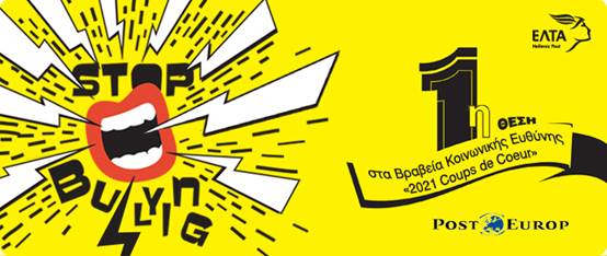 Το βραβείο «Coup de Coeur 2021» της PostEurop απονεμήθηκε φέτος στα ΕΛΤΑ για τη δράση κοινωνικής ευθύνης «Stop Bullying». Τα βραβεία «Coups de Coeur» αποτελούν την ετήσια επιβράβευση των βέλτιστων πρακτικών κοινωνικής ευθύνης των ταχυδρομικών φορέων της Ευρώπης στις κατηγορίες «Κοινωνία», «Ανθρώπινο Δυναμικό» και «Περιβάλλον».